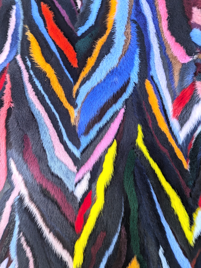 This practical, one of a kind fur jacket has been handcrafted from repurposed mink fur sections in David Appel’s fur shop, and brings a unique splash of color to your outfit! Comfortable medium, dress up or dress down. It features...