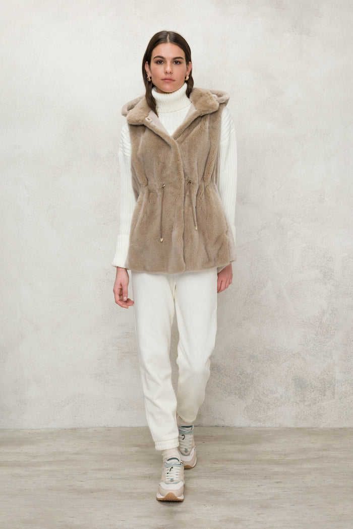 Made in Italy, this Suprema vest is perfect for a brisk autumn day. And it will go with everything in your closet! With one side made of soft Merino shearling, and the reversible side made from premium cashmere, you can switch the outfit up to match your mood! It features a removable hood, a shirt style collar, and a drawstring to tighten the waist. It has 4 snap button closures, and 2 pockets on the outside as well as 2 more pockets on the inside.
